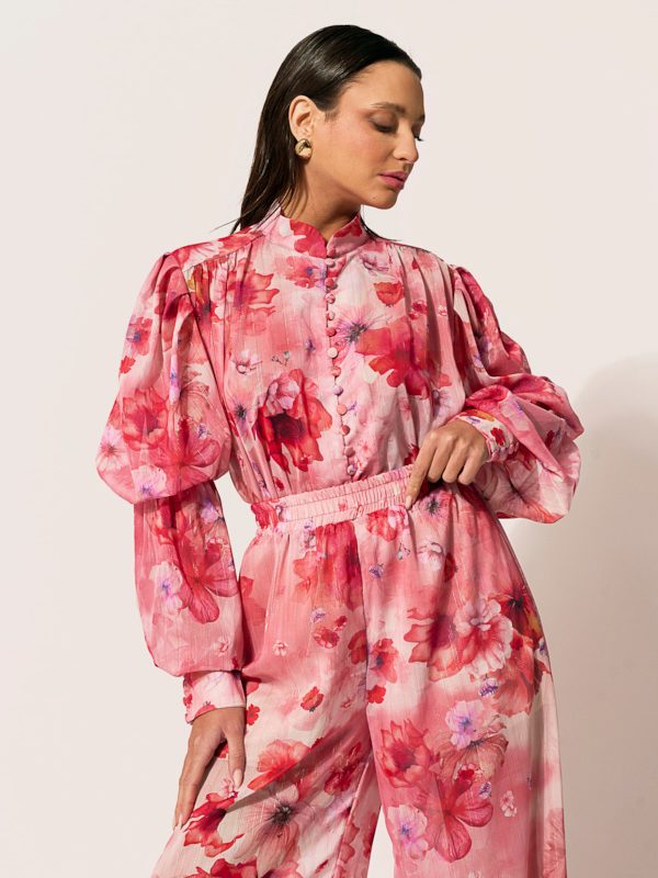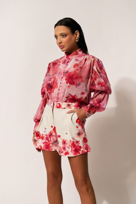 Το Marielle Shirt είναι ένα αέρινο floral γυναικείο πουκάμισο που ξεχωρίζει για τα ντυμένα κουμπιά από το ίδιο ύφασμα, τις σούρες στους ώμους και το έντονο floral print σε ροζ και κόκκινες αποχρώσεις. Η μουσελίνα με χρυσοκλωστή στην ύφανση προσθέτει διακριτική λάμψη, ενώ η χαλαρή γραμμή του το καθιστά ιδανικό για ιδιαίτερες ανοιξιάτικες εμφανίσεις.