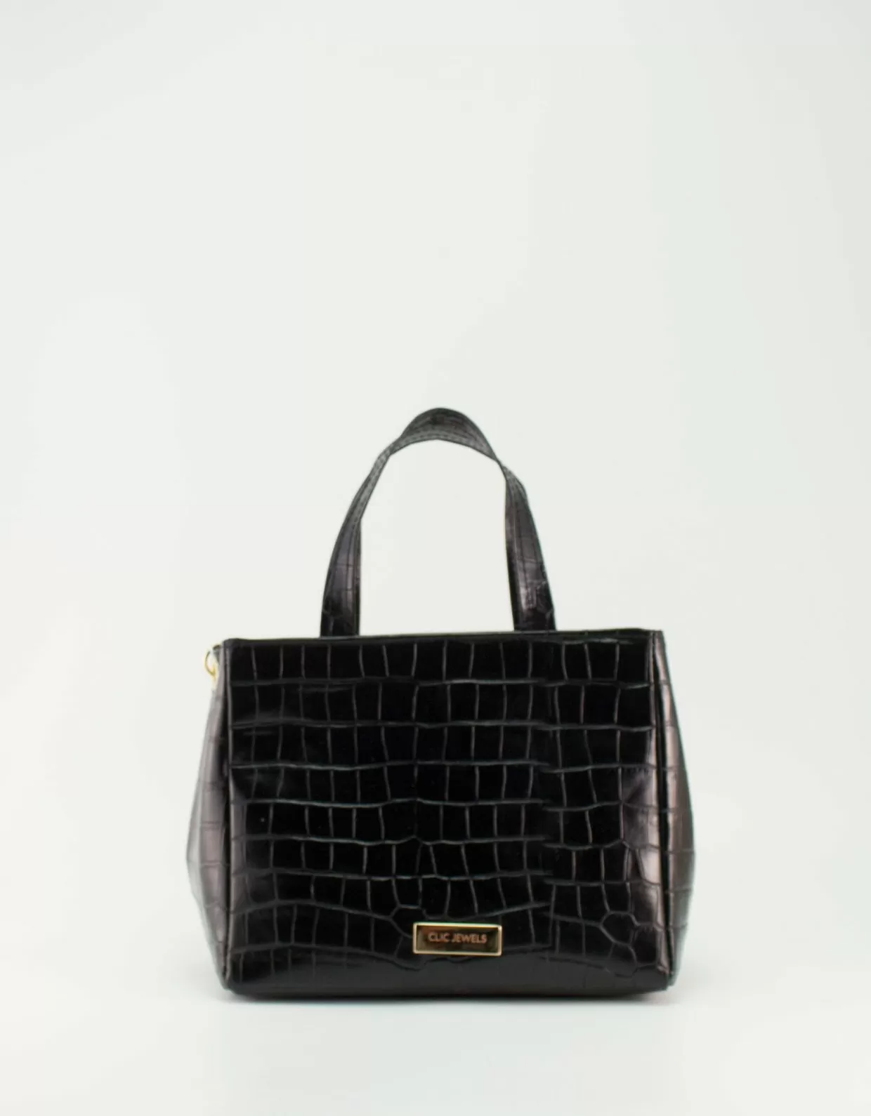 Μίνι τσάντα χειρός από κροκό δέρμα, με χερούλια, φόδρα, εσωτερική θήκη, αποσπώμενο δερμάτινο λουράκι για κράτημα στον ώμο και κλείσιμο με φερμουάρ.