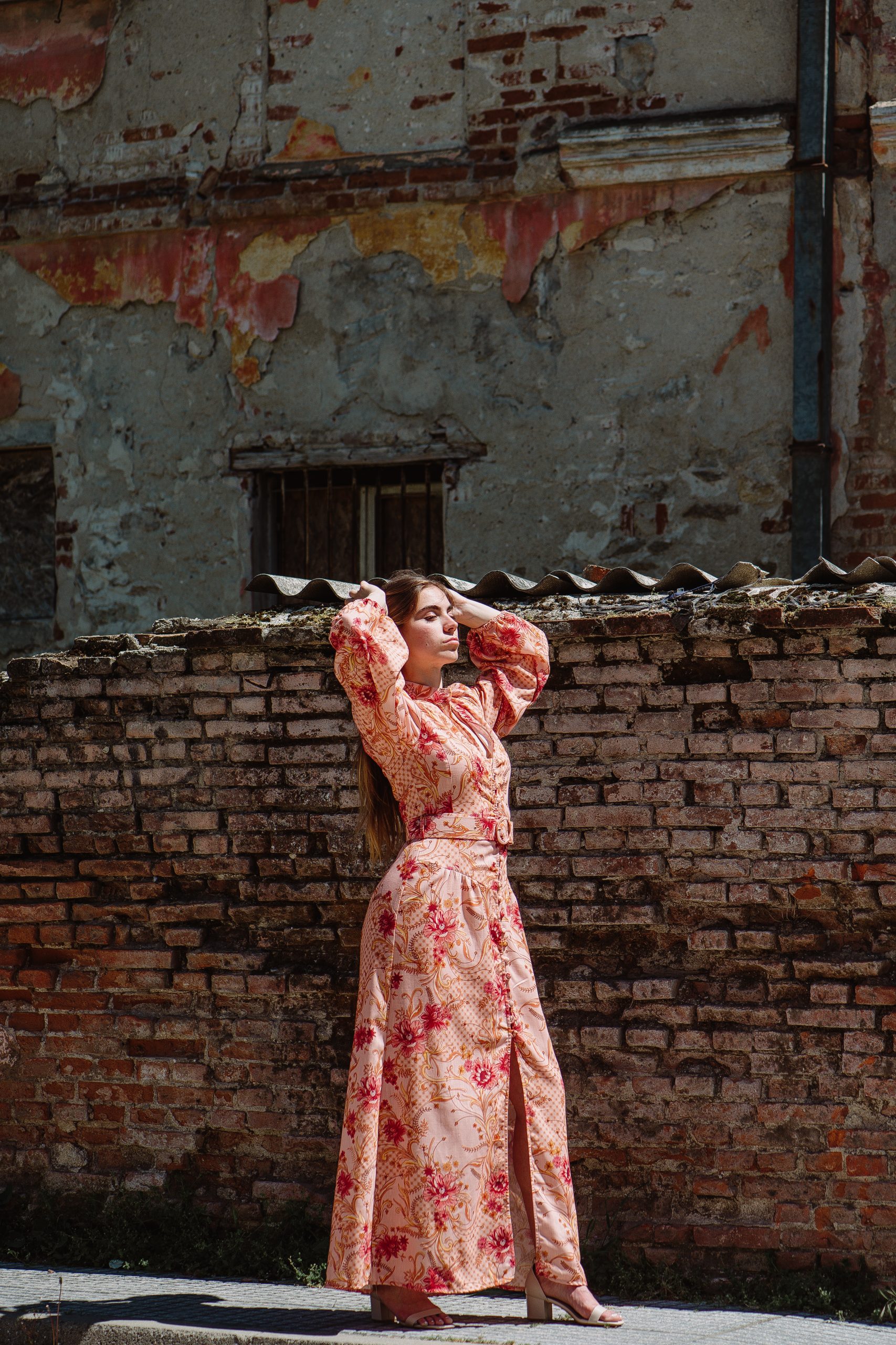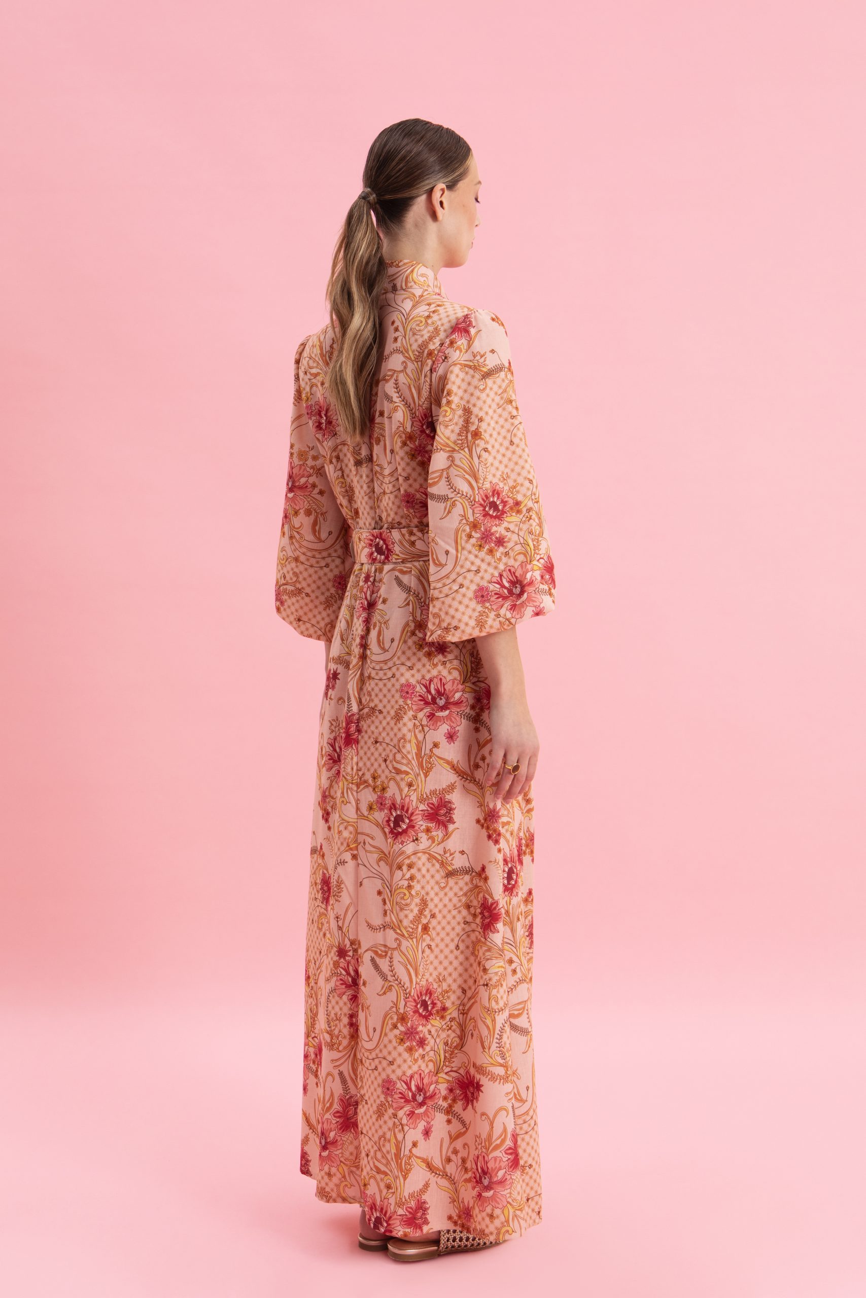 Αυτό το φόρεμα είναι ένα μακρύ, κομψό κομμάτι με ξεχωριστή αισθητική, ιδανικό για ιδιαίτερες περιστάσεις αλλά και στιλάτες καθημερινές εμφανίσεις. Πρόκειται για μακρύ λινό φόρεμα με γιακά Mandarin, μακριά μανίκια balloon με λάστιχο στο τελείωμα και αποσπώμενη ζώνη στη μέση που τονίζει τη σιλουέτα. Είναι διακοσμημένο με ρομαντικό floral μοτίβο σε αποχρώσεις του ροζ, πορτοκαλί και φούξια, προσδίδοντας θηλυκότητα και φρεσκάδα. Κουμπώνει μπροστά με επενδυμένα κουμπιά στο ίδιο ύφασμα, ενισχύοντας τη μίνιμαλ κομψότητα του ρούχου.