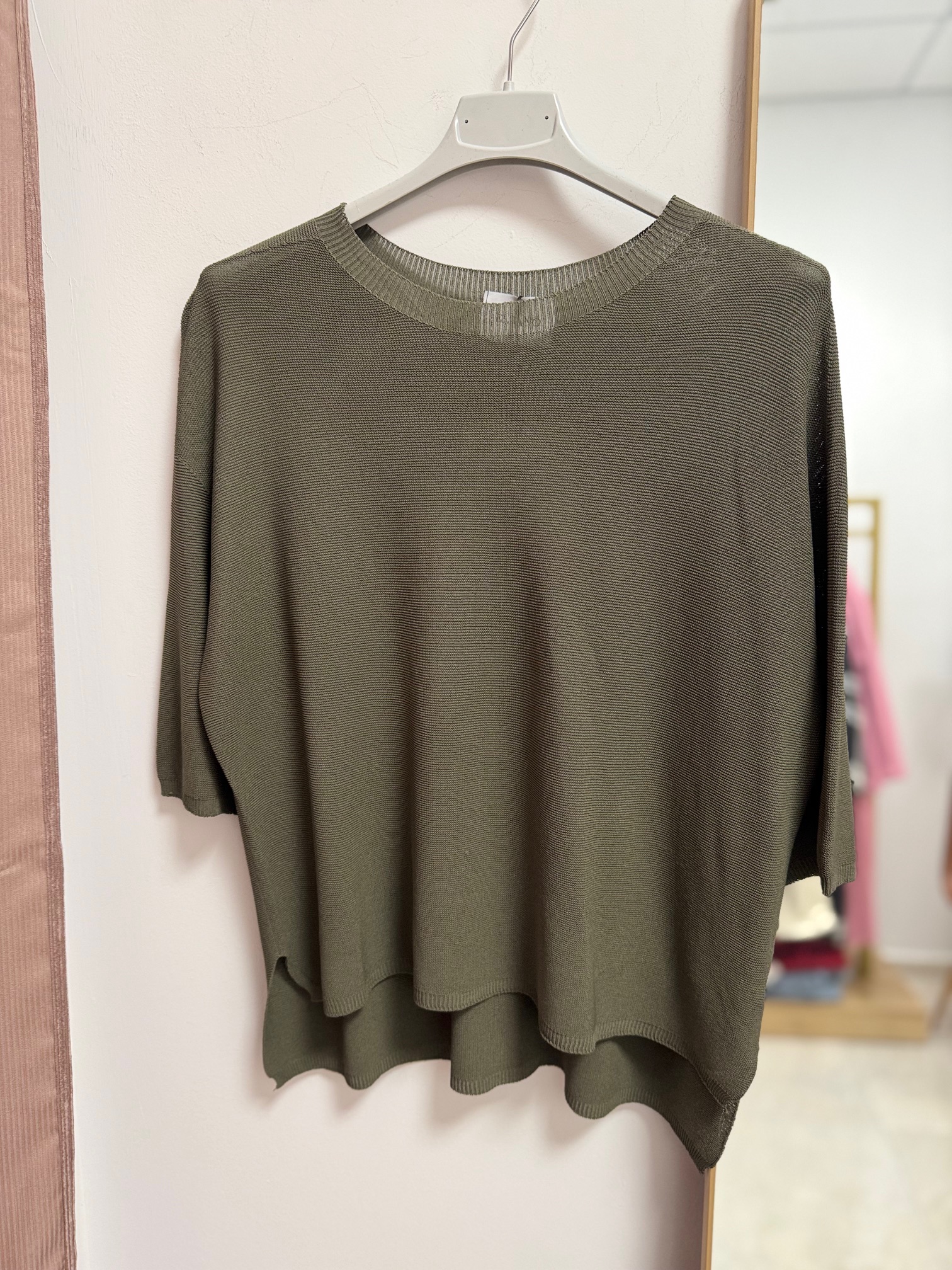 Πλεκτό τοπ με χαλαρή, άνετη γραμμή και 3/4 μανίκια. Διαθέτει στρογγυλή λαιμόκοψη, η οποία προσφέρει δομή στην εφαρμογή του. Το ελαφρώς μακρύτερο πίσω μέρος λειτουργεί ως statement λεπτομέρεια, προσθέτοντας χαρακτήρα και μια παιχνιδιάρικη, editorial διάθεση στο σχέδιο. Ένα κομμάτι που φοριέται εύκολα από το πρωί μέχρι το βράδυ, συνδυάζεται εύκολα με παντελόνια ή φούστες.