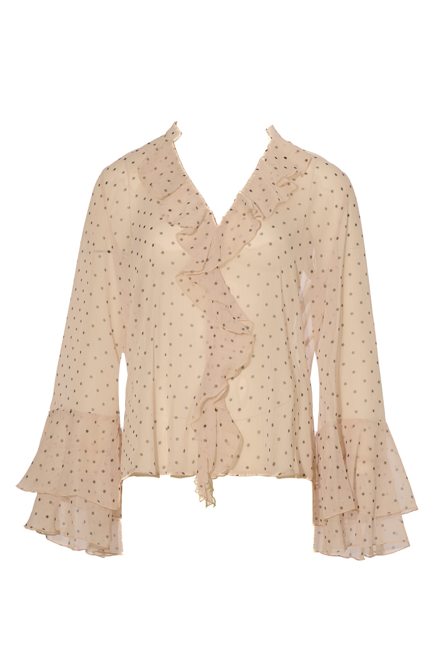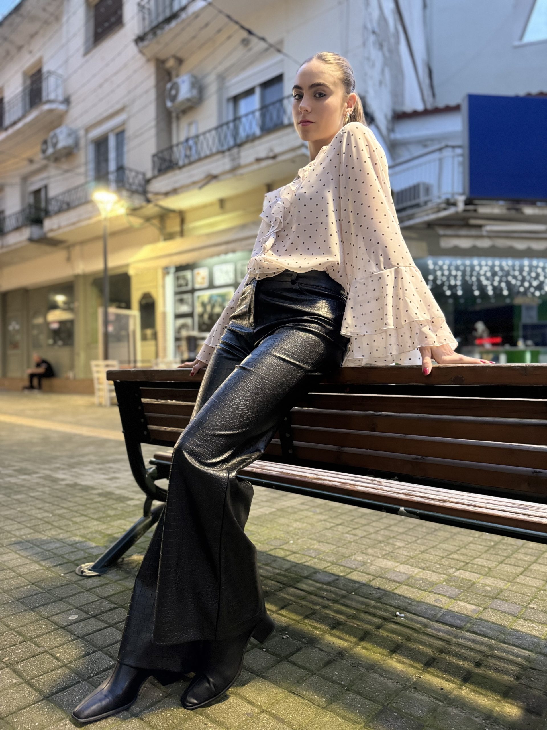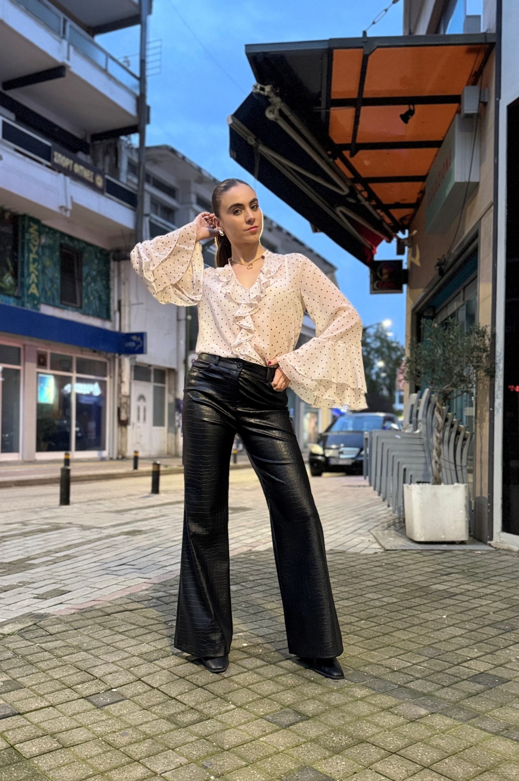 Διαχρονικό και θηλυκό, το Polka Dot τοπ είναι ένα κομμάτι που δεν πρέπει να λείπει από καμία γκαρνταρόμπα. Ενσαρκώνει την κλασική γοητεία του πουά με μια δόση ρομαντισμού και ανεπιτήδευτης φινέτσας. Το V ντεκολτέ του πλαισιώνεται από βολάν που χαρίζουν κίνηση και αέρα θηλυκότητας, ενώ τα βολάν στα μανίκια προσθέτουν ρομαντική λεπτομέρεια.