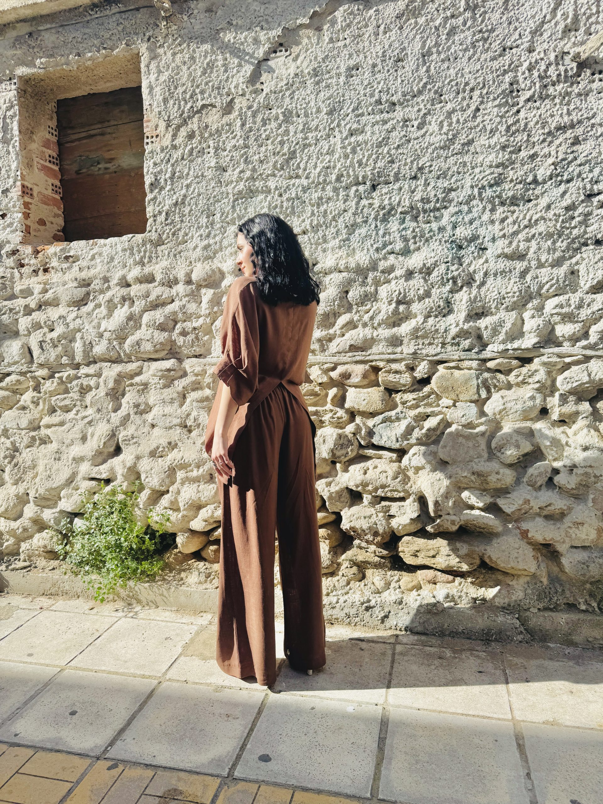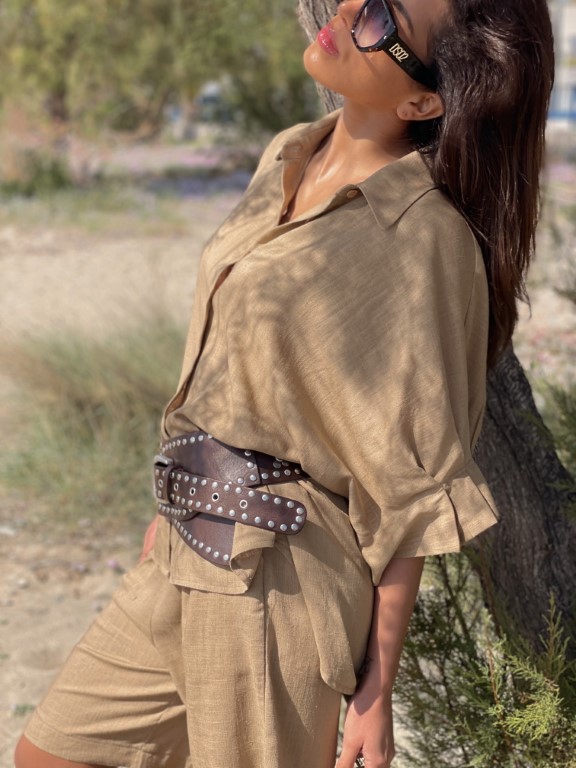 Ανακάλυψε το απόλυτο κομμάτι για άνεση με στυλ, το οποίο συνδυάζει χαλαρή γραμμή με διαχρονική κομψότητα. Φτιαγμένο από ύφασμα φυσικής υφής, προσφέρει δροσερή αίσθηση, απαλή υφή και ανάλαφρη κίνηση. Με χαλαρό γιακά, κρυφό κούμπωμα και διακριτικά γυριστά μανίκια 3/4, αυτό το oversized πουκάμισο φοριέται ως tunic, ως ανοιχτή πουκαμίσα ή με ζώνη για μια πιο structured σιλουέτα. Η γήινη, σοφιστικέ απόχρωση το καθιστά ιδανικό για την πόλη ή για τις διακοπές σου στα νησιά.