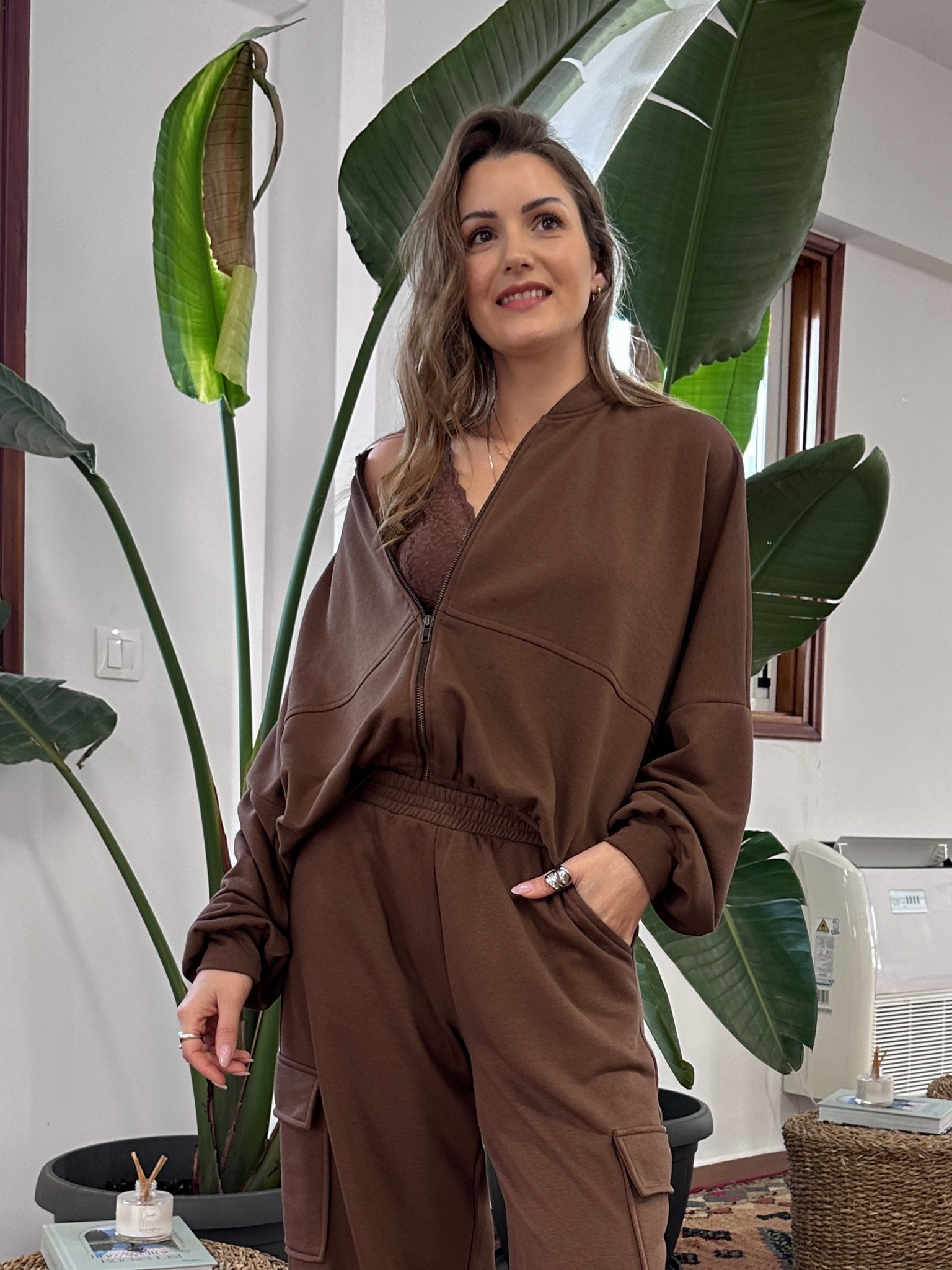 Tο Chocolate Cargo Pant είναι μία Oversized ζακέτα με φερμουάρ και ριχτούς ώμους (drop shoulders) για χαλαρή εφαρμογή. Η ελαστική φάσα στο κάτω μέρος επιτρέπει να φορεθεί είτε κανονικά είτε ελαφρώς ανασηκωμένη. Εξαιρετικής ποιότητας βαμβακερό ύφασμα με απαλή υφή, που αγκαλιάζει το σώμα και διατηρεί τη φόρμα του. Σε πλούσια, ζεστή σοκολατί απόχρωση που αποτελεί την κορυφαία τάση της σεζόν και συνδυάζεται εύκολα με χρυσά αξεσουάρ.