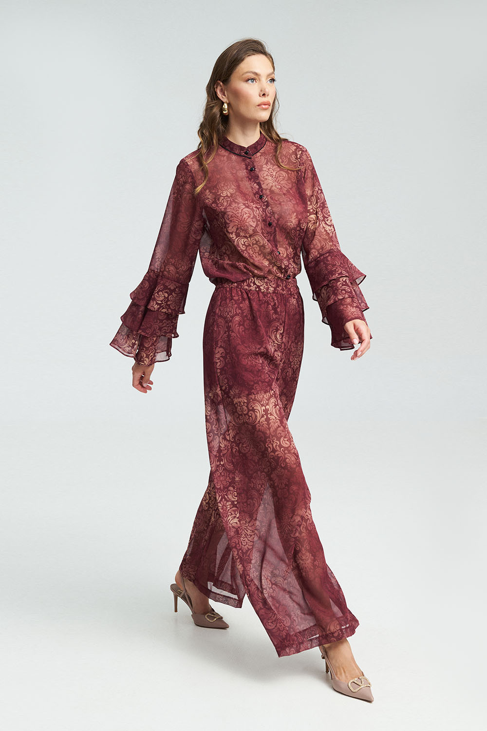 Το Ophelia Shirt είναι ένα εντυπωσιακό πουκάμισο που συνδυάζει αέρα πολυτέλειας και ρομαντισμού. Φτιαγμένο από ανάλαφρο, ημιδιάφανο ύφασμα με μπαρόκ μοτίβο σε αποχρώσεις του μπορντό, αποπνέει κομψότητα σε κάθε κίνηση. Διαθέτει κουμπιά μπροστά και μακριά μανίκια με διπλά βολάν που δημιουργούν δραματικό και θηλυκό αποτέλεσμα. Ιδανικό για να συνδυαστεί με την αντίστοιχη παντελόνα σε βραδινές εξόδους, με φούστες σε ουδέτερες ή αντίστοιχες αποχρώσεις, αλλά και τα τζιν σας για τα καθημερινά σας look.