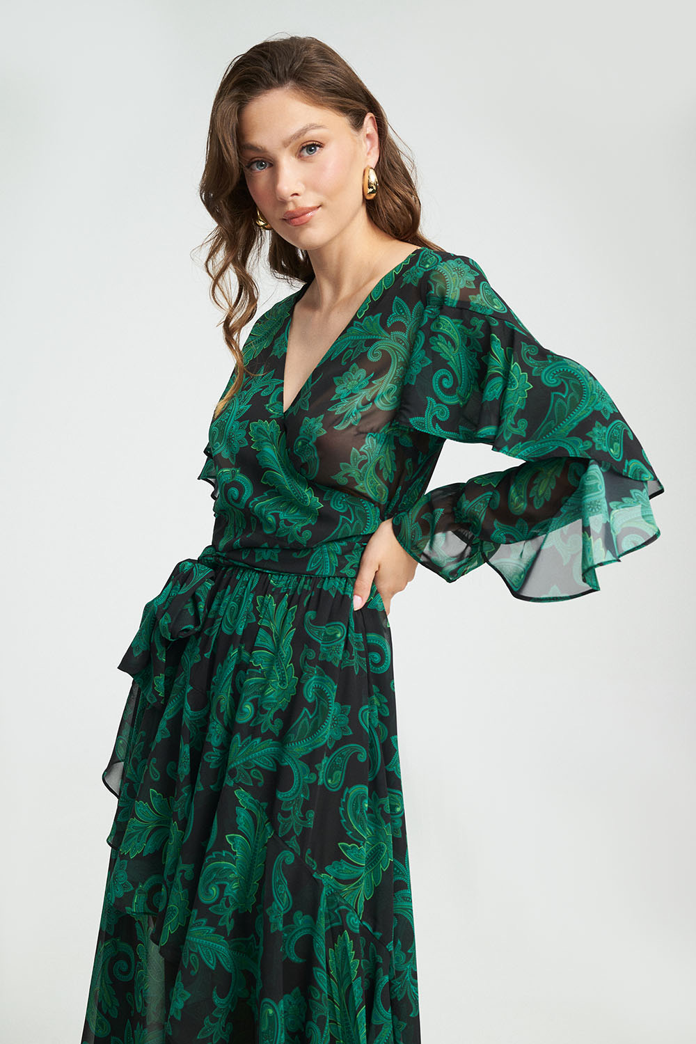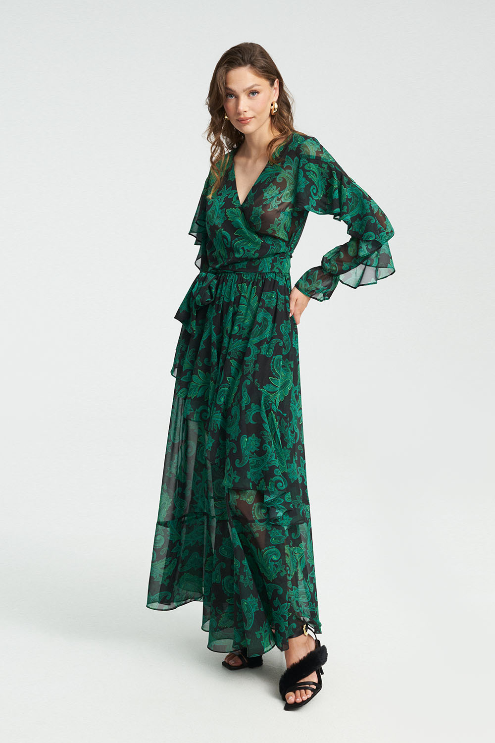 Το Selena είναι ένα statement φόρεμα που συνδυάζει θηλυκότητα και αέρινη κομψότητα. Το εντυπωσιακό πράσινο μοτίβο σε μαύρη βάση αποπνέει πολυτέλεια, ενώ τα μανίκια με βολάν προσδίδουν ρομαντική κίνηση, ενώ η maxi γραμμή του ολοκληρώνει ένα look που μαγνητίζει τα βλέμματα. Το ιδιαίτερο πατρόν του δημιουργεί την αίσθηση δύο κομματιών στο μπροστινό μέρος, ενώ στο πίσω μέρος παραμένει ενιαίο, χαρίζοντας άψογη εφαρμογή. Ιδανικό, τόσο για βραδινές εξόδους όσο και για ιδιαίτερες περιστάσεις, αλλά και events όπου θέλεις να ξεχωρίσεις.