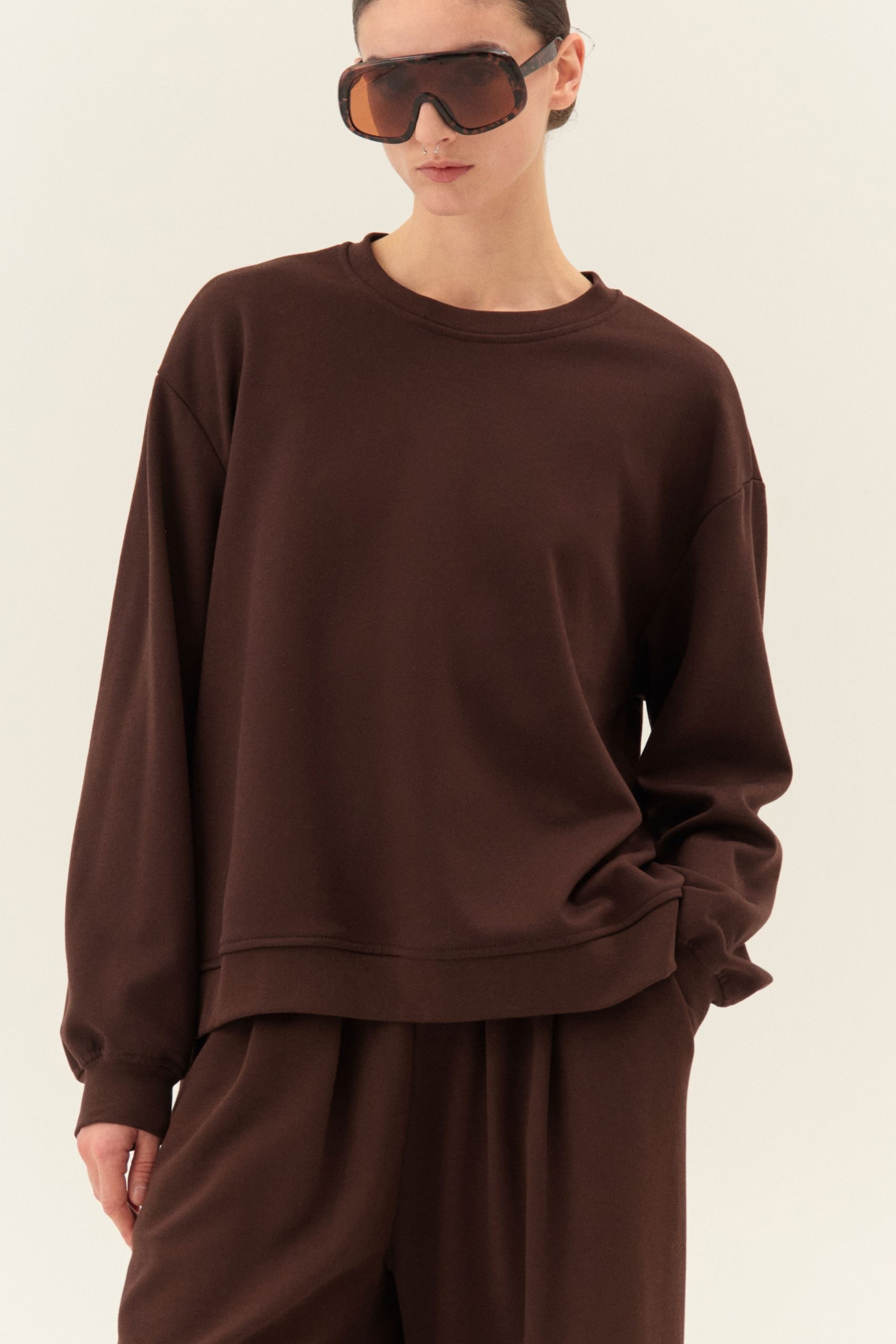 Το Lumina Sweatshirt – Brown είναι ένα κομψό και άνετο φούτερ σε πλούσια σοκολατί απόχρωση. Διαθέτει στρογγυλή λαιμόκοψη (crew neck) και χαλαρή, oversized γραμμή που προσφέρει απόλυτη άνεση και μοντέρνα εμφάνιση. Το ύφασμά του είναι μαλακό, ιδανικό για καθημερινή χρήση και layered looks. Με ελαστικά τελειώματα στα μανίκια και στο κάτω μέρος, εξασφαλίζει σταθερή εφαρμογή ενώ διατηρεί το casual-chic ύφος του. Ένα διαχρονικό κομμάτι που μπορεί να φορεθεί από το πρωί μέχρι το βράδυ, είτε μόνο του είτε ως μέρος ενός άνετου σετ.