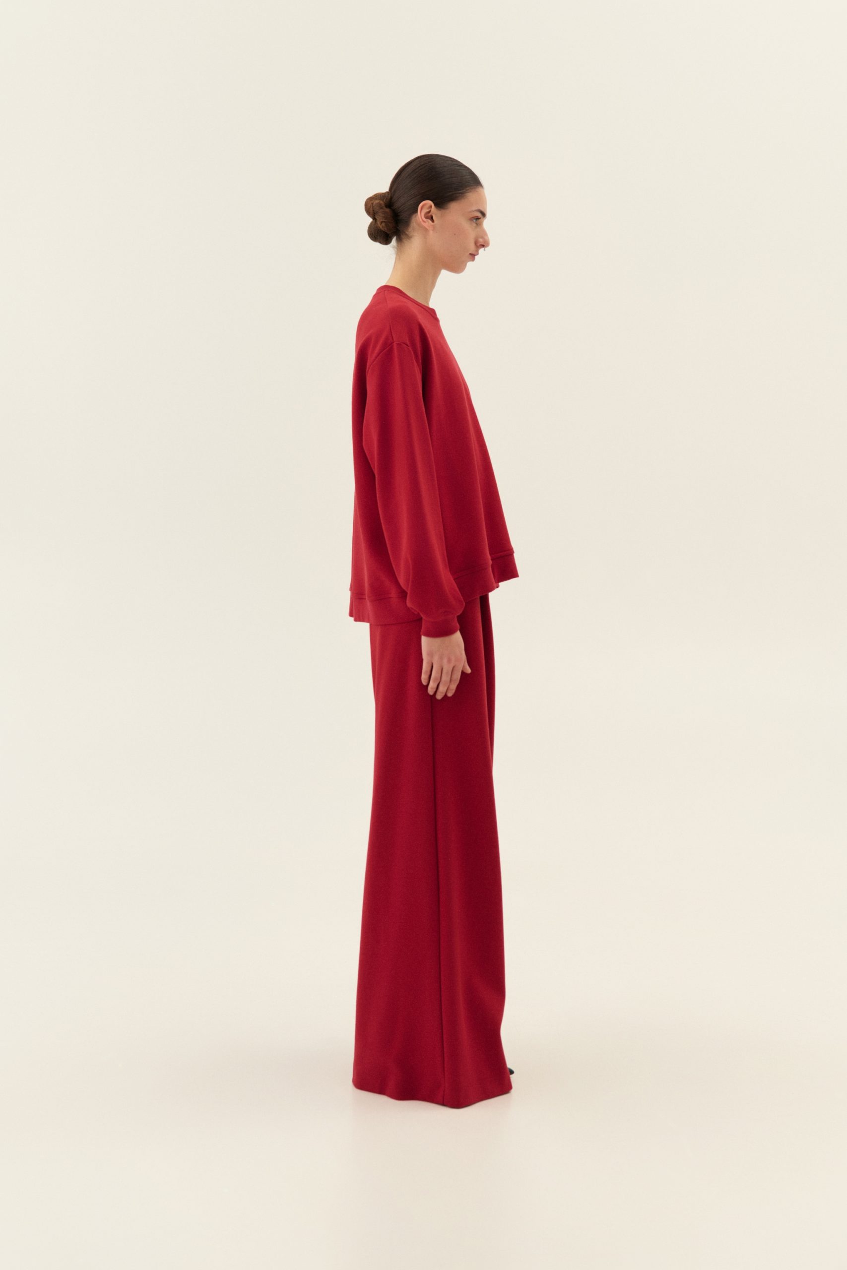 Το παντελόνι είναι φτιαγμένο από μαλακό ύφασμα, με loose γραμμή που δημιουργεί μια άνετη και χαλαρή αίσθηση. Έχει ελαστική μέση με έντονη ραφή, ενώ το κόκκινο χρώμα προσδίδει μια ζωντανή και δυναμική εμφάνιση. Το στυλ του είναι minimal και μοντέρνο, ιδανικό για casual εμφανίσεις ή για χαλαρές εξόδους