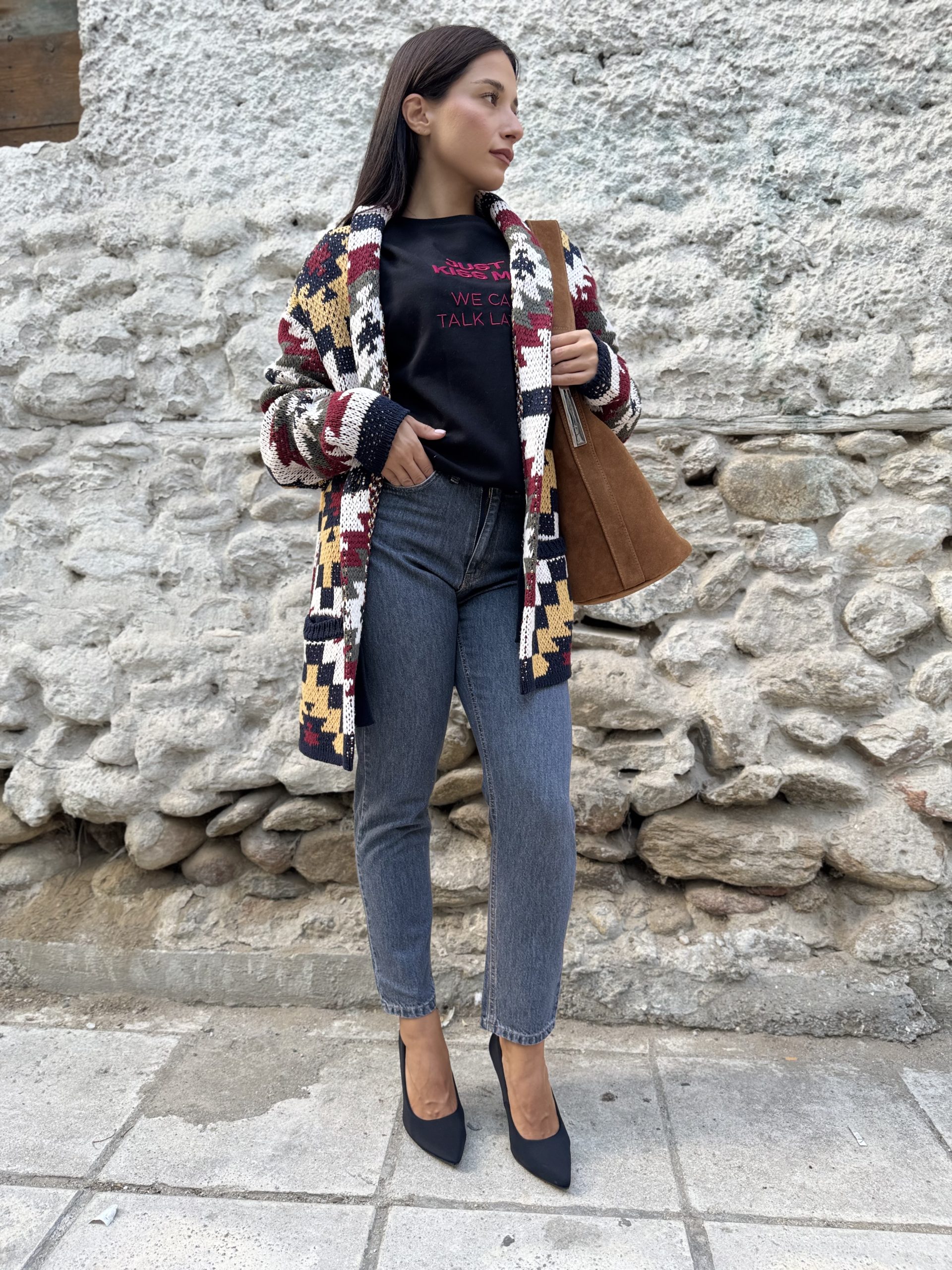 - Μακριά πλεκτή ζακέτα με έντονο γεωμετρικό/patchwork μοτίβο