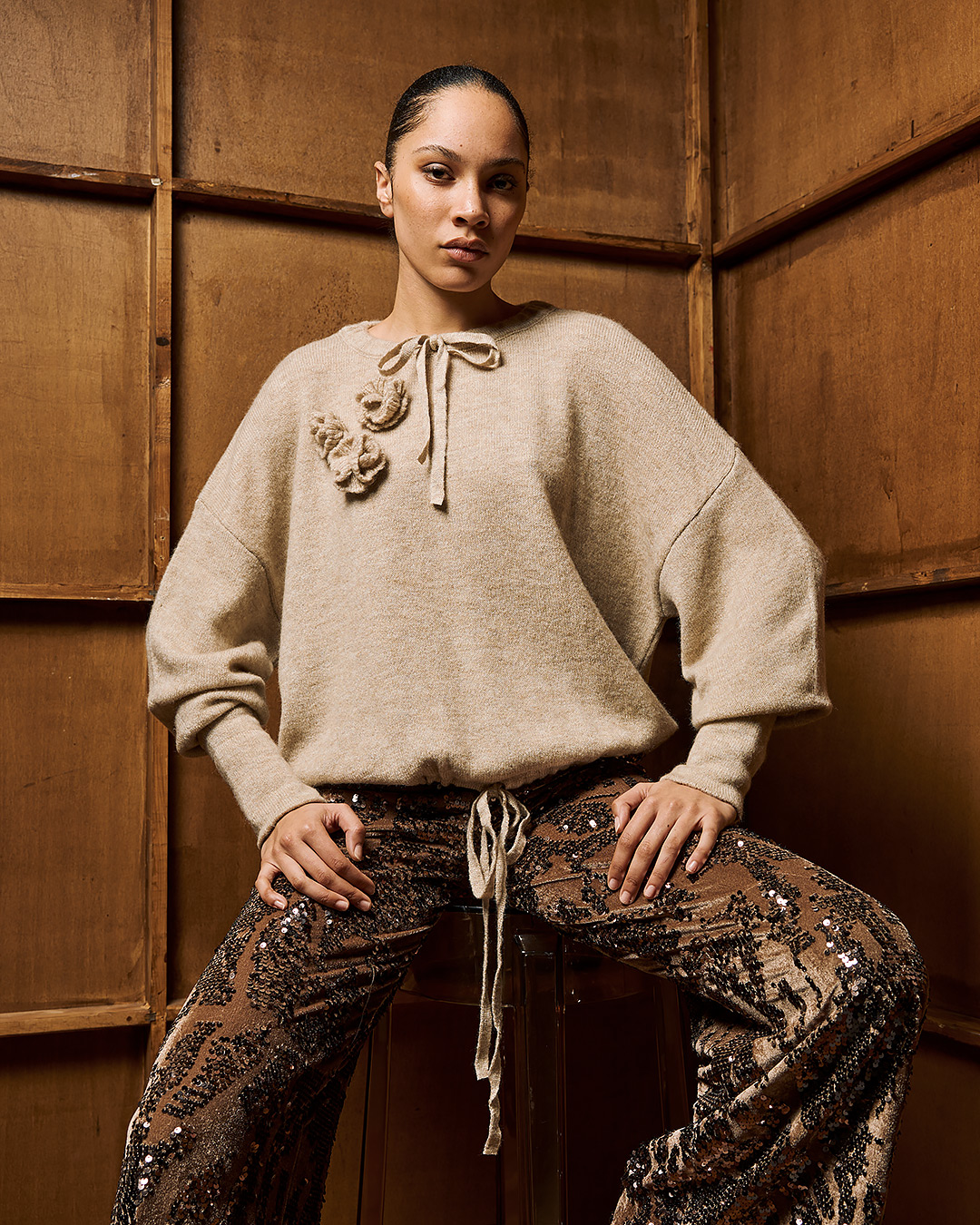 Ένα πλεκτό μπλουζάκι με τριαντάφυλλα, που χαρίζει θηλυκό και κομψό χαρακτήρα. Ιδανικό για φθινοπωρινές και χειμερινές εμφανίσεις, μπορεί να φορεθεί με παντελόνι, φούστα ή ακόμα και πάνω από φόρεμα, δίνοντας cozy αλλά και chic αποτέλεσμα.