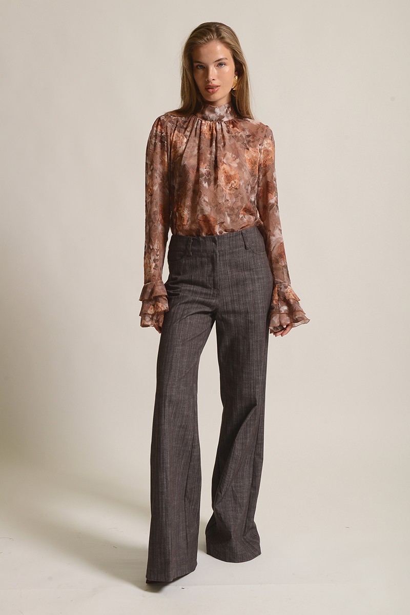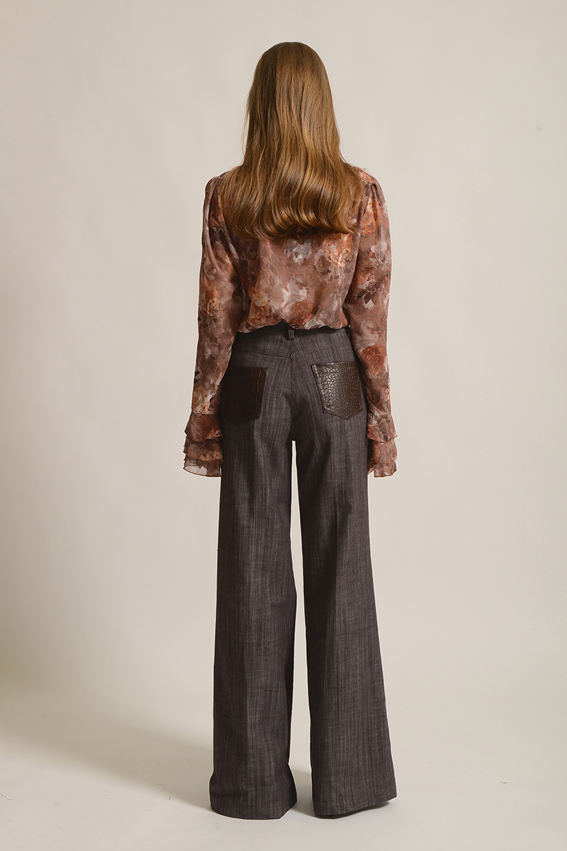 Ψηλόμεσο κομψό τζιν παντελόνι σε ίσια, ελαφρώς καμπάνα γραμμή, σε καφέ-γκρι απόχρωση. Διαθέτει πλαϊνές τσέπες και πίσω τσέπες με λεπτομέρεια από faux croco δέρμα για ιδιαίτερο στιλιστικό τόνο. Κλείνει μπροστά με φερμουάρ και γάντζο. Ιδανικό για day-to-night εμφανίσεις με σοφιστικέ χαρακτήρα.
